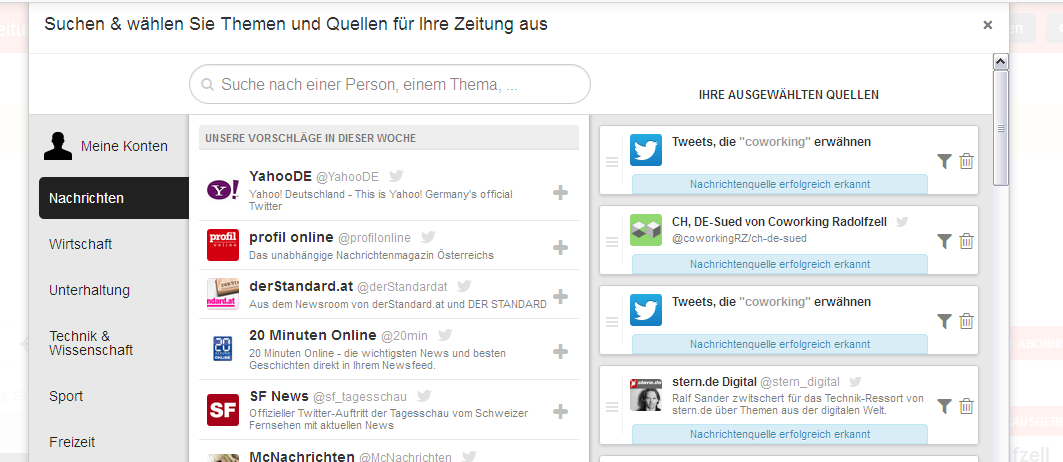 Wie häufig dieses Potpourri mit Beiträgen aus Twitter, Facebook, YouTube etc. herausggeben wird kann ebenfalls definiert werden. Im Bearbeitungsmodus können die einzelnen Artikel dann entfernt oder modifiziert werden. Ausserdem kann ausgewählt werden aus welchen Quellen die Beiträge gezogen werden.
