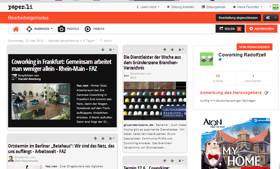 Seit ein paar Wochen läuft das paper.li Coworking DE und Coworking EN (englisch) ist in der Mache. Erstaunlich wie interessant die Beiträge Fotos, und Filme zum Teil sind. Die Standard Version ist kostenfrei ein kostenpflichtiges Upgrade wird angeboten